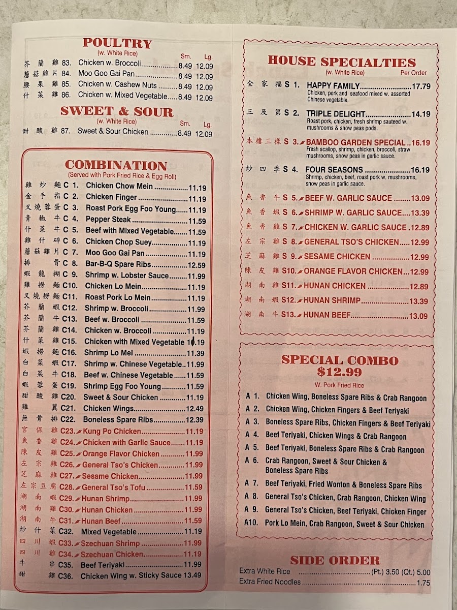 If you're craving classic Chinese dishes, the Bamboo Garden Chinese Restaurant Menu is the perfect spot to indulge. Located at 944 Boston Neck Rd in Narragansett, this cozy restaurant offers a variety of delicious options to suit any taste. Whether you're in the mood for savory stir-fries, hearty soups, or fresh seafood, there's something for everyone. You’ll find traditional favorites like General Tso's Chicken, Sweet and Sour Pork, and a selection of mouthwatering dumplings. The menu also features a variety of vegetarian and gluten-free options, making it easy to find a meal to suit any dietary preference. With a warm and inviting atmosphere, Bamboo Garden is the ideal place to share a meal with friends and family while enjoying all your Chinese food favorites.